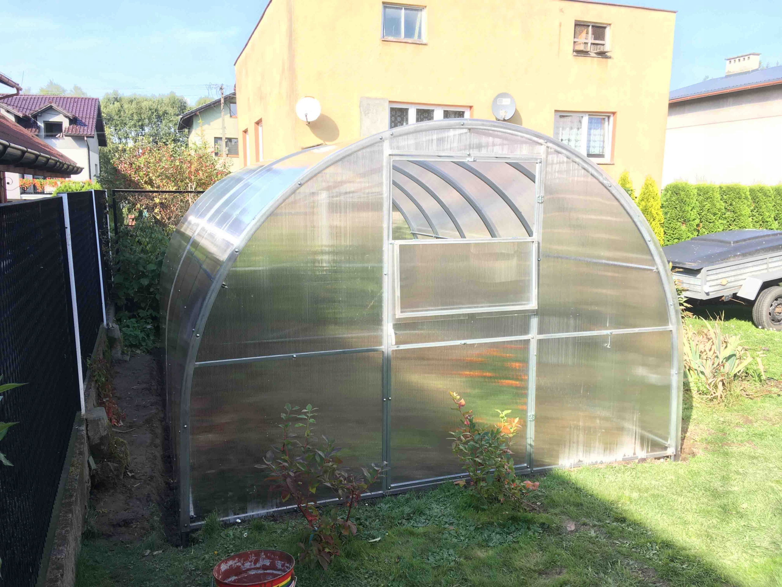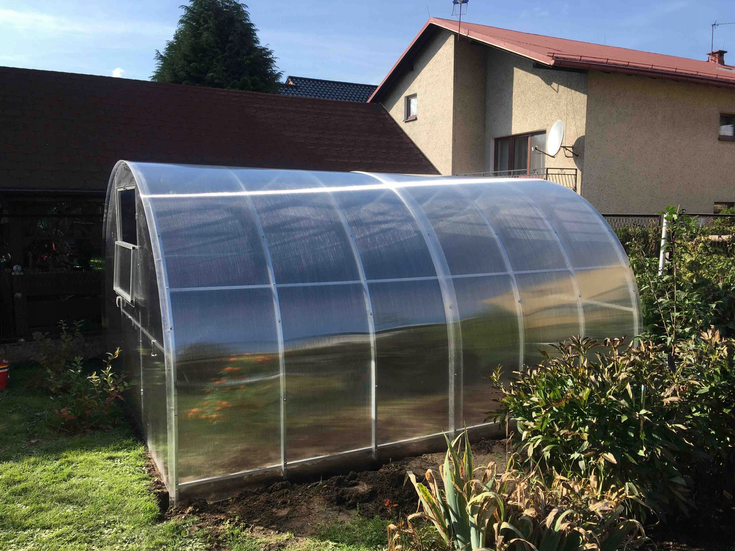 Сучасна та проста в установці конструкція зі сталі 0,8 мм, оцинкована гарячим способом з обох сторін. Арки зроблені з одного елемента - вони зігнуті, фасади зварені. У набір входять Т-подібні анкери для кріплення до землі та набір шурупів. Чохол виготовлений із стійкого полікарбонату, стійкого до УФ-випромінювання та граду. Напівкругла форма теплиці запобігає накопиченню снігу