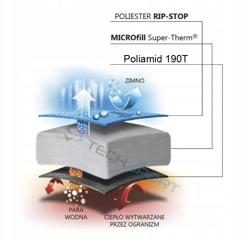 - Шар зсередини - Поліамід 190T - Приємний контакт зі шкірою, а не слизьким, до дотику, подібного до бавовняного матеріалу, не зливши тепло, що утворюється організмом, передаючи водяну пару.