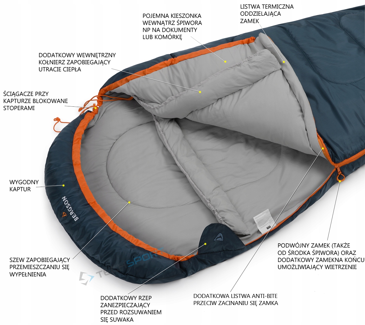 Високоякісний фірмовий спальний мішок Bergson Weekend 300 характеризується дуже хорошими ізоляційними властивостями, високою якістю виготовлення та запатентованими технологіями, такими як структура наповнення: Insuloft© та сучасні міцні поліефірні тканини. Завдяки цьому він досягає реального екстремуму -4 градуси. Має двошвидкісну блискавку, що також дозволяє розстібати його знизу і регулювати температуру в спальнику. Додаткова стрічка системи Anti-Bite захищає матеріал від врізання в блискавку. Доступні із застібками-блискавками з правого та лівого боку, тому їх можна об’єднати в один великий спальний мішок. Практичний чохол також має компресійні ремені, які регулюють розмір спального мішка, і ручку для перенесення. Новий, оригінальний спальний мішок, з набором бирок.
