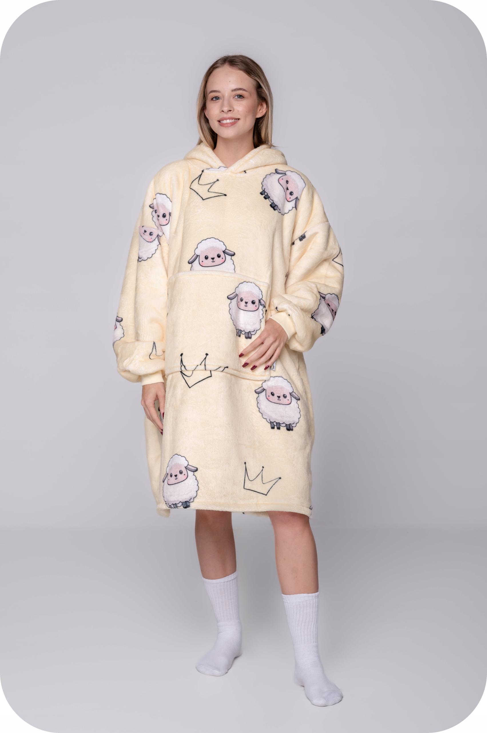 Він функціонує яксвітшот і ковдра. Спереду є велика кишеня, яка не тільки зігріє руки, але й дозволить зберігати такі речі, як телефон, пульт, книгу та багато інших. Великий капюшон можна використовувати як подушку, наприклад, під час подорожі, читання книги на дивані або перегляду улюбленого серіалу.