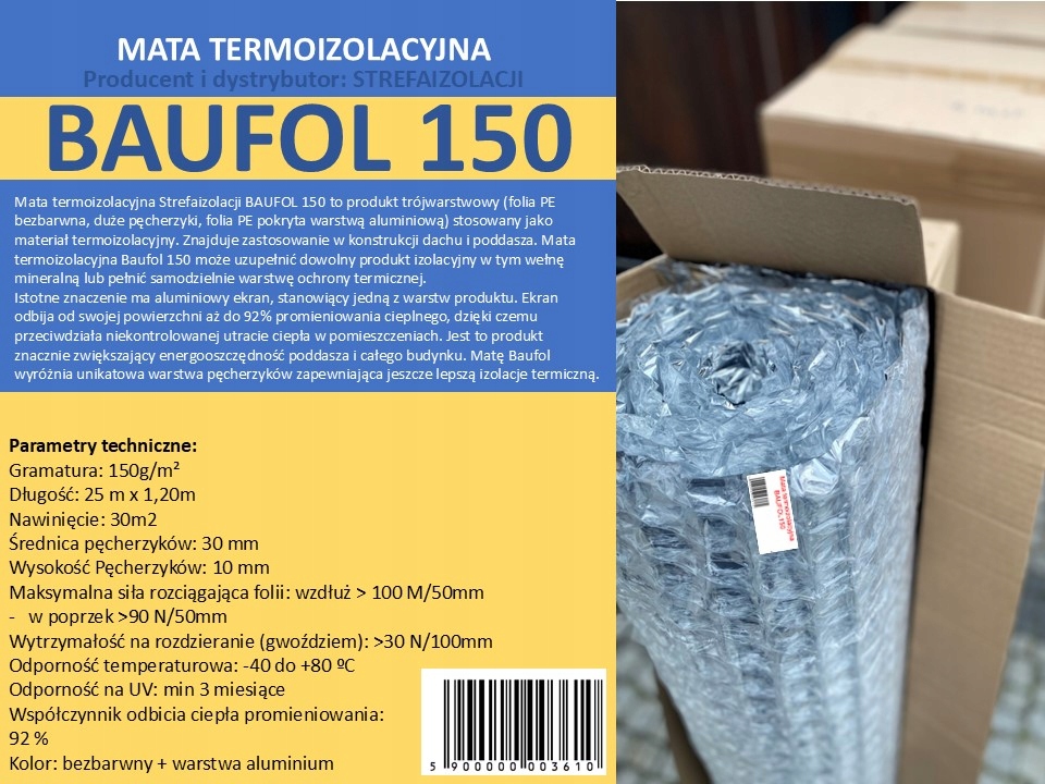 Важливий також алюмінієвий екран, який є одним із шарів виробу. Екран відбиває до 92% теплового випромінювання від своєї поверхні, запобігаючи неконтрольованим тепловтратам у приміщеннях. Це продукт, який значно підвищує енергоефективність мансарди та всієї будівлі. Мат Baufol відрізняється унікальним шаром дрібних бульбашок, що забезпечує ще кращу теплоізоляцію.