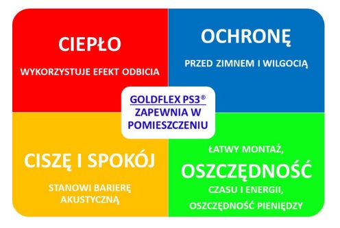 Ізоляційна піна GOLDFLEX PS3®, що складається з двох внутрішніх шарів пінопласту, ламінованого з обох сторін шаром фольги LDPE та шаром алюмінію металізована поліефірна фольга. Товщина пінопласту 10мм. Така конструкція гарантує відбиття теплового випромінювання зсередини приміщення і захищає його від проникнення холоду. Фольга також захищає від вологи та створює акустичний бар’єр (до 20 дБ).