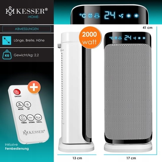 - Два рівні нагріву: 1000W та 2000w , з можливістю встановлення температури в діапазоні 10-35 ° C