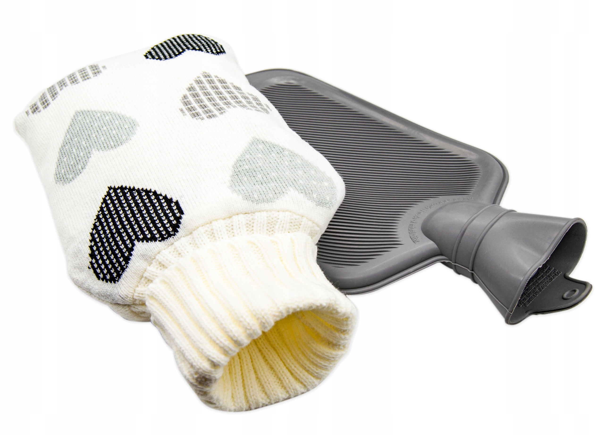 - грілка в біло-сірій кришці з візерунком у формі серця.