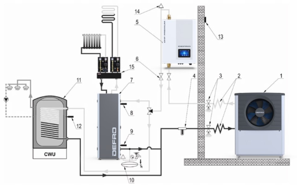 6. запірна арматура, 7. буферна ємність, 8. буферний датчик - верх, 8. буферний датчик - нижній, 10. розширювальний бак з групою безпеки