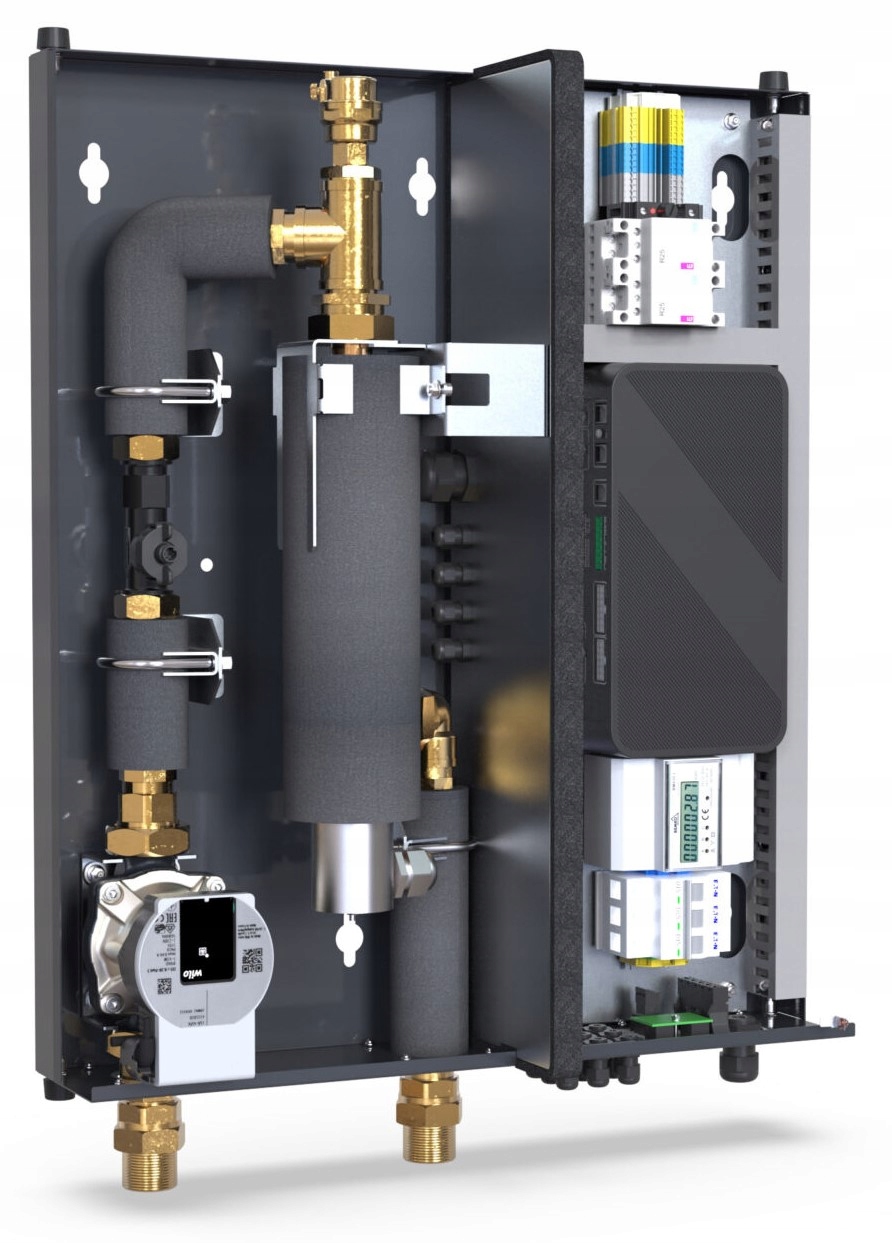 Включає циркуляційний насос з ШІМ, нагрівач 6 кВт, лічильник електроенергії, витратомір, силові кабелі та 9 шт. На корпусі встановлений вдосконалений контролер із сенсорним дисплеєм, який відповідає за правильну роботу всіх компонентів.