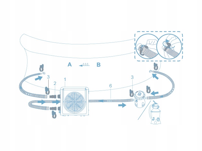 Забудьте про складну установку! Ви можете швидко та легко підключити бест -тепловий насос до вашого басейну. Він сумісний з насосами -фільтруванням з ємністю з 2006 л/год. IPX5 водостійкість та практичний перемикач з датчиком води забезпечують безпеку та зручність використання.