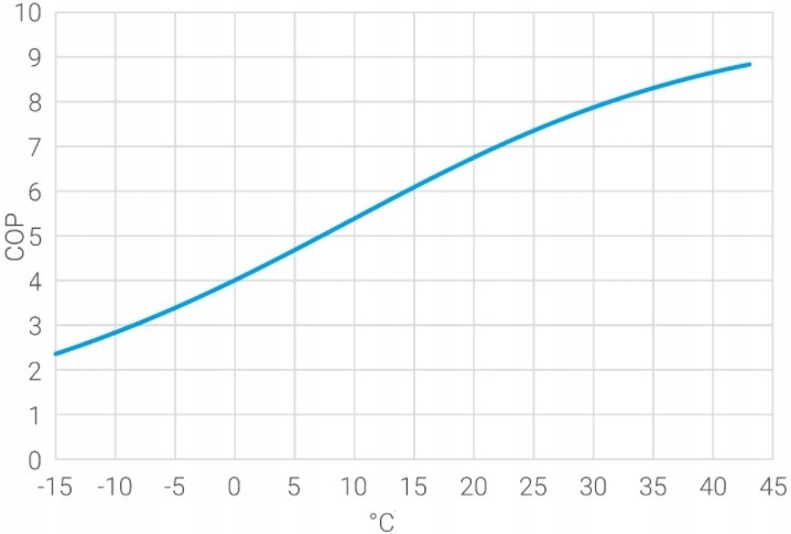 Забезпечує високу ефективність обігріву до зовнішньої температури -25° C і може стабільно працювати без допомоги електронагрівачів навіть при температурі навколишнього середовища -15°C. Максимальна доступна температура води в режимі опалення: 65°C, а в режимі ГВП: 60°C.