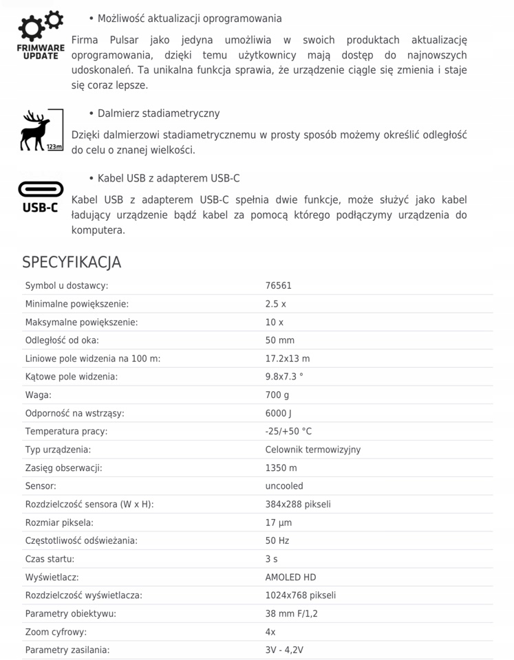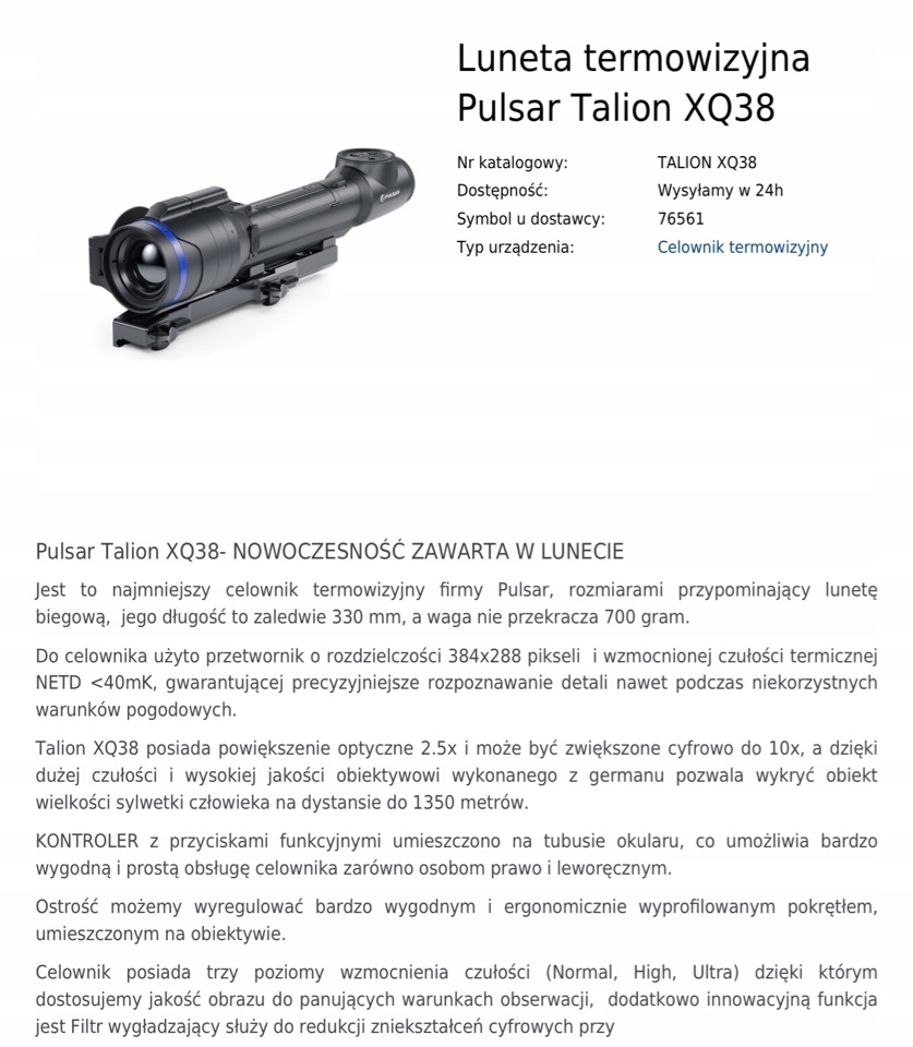 Просматривая «Тепловізійний приціл Pulsar Talion XQ38», вы можете быть уверены, что данный товар из каталога «Ночного видения» будет доставлен из Польши и проверен на целостность. В цене товара, указанной на сайте, учтена доставка из Польши. Внимание!!! Товары для Евросоюза, согласно законодательству стран Евросоюза, могут отличаться упаковкой или наполнением.