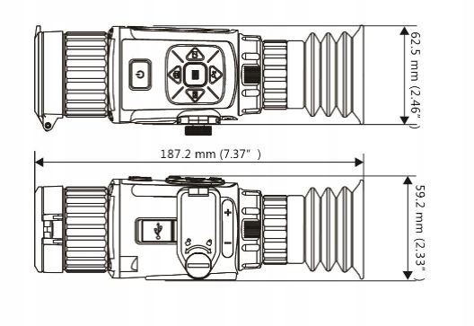 Hikmicro Thunder Pro TE25 має легкий і міцний корпус із алюмінієвого сплаву (магналії) . Це робить Thunder Pro TE25 найлегшим прицілом у своєму класі на ринку з розмірами 187,2 × 62,5 × 59,2 мм. Алюмінієва конструкція також гарантує стійкість до ударів, ударів і погодних умов. Корпус захищений від води, пилу та вологи (клас IP67), тому приціл стійкий до будь-яких погодних умов, які можуть виникнути під час полювання. Надзвичайно важливо дотримуватись тиші під час переслідування тварин, тому для керування прицілом використовуються безшумні гумові кнопки.