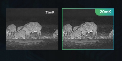 Висока теплова чутливість забезпечує чудове розпізнавання деталей навіть у найскладніших атмосферних умовах, коли об’єкт і фон мають мінімальну різницю температур. Крім того, власно розроблений тонкоплівковий матеріал TCR з високим вмістом оксиду ванадію значно покращує чутливість. Найдрібніші деталі об’єктів і фону можна легко й чітко визначити, наприклад, шерсть тварин, фізичні особливості самців, самок чи вагітних тварин, гілки, листя тощо.