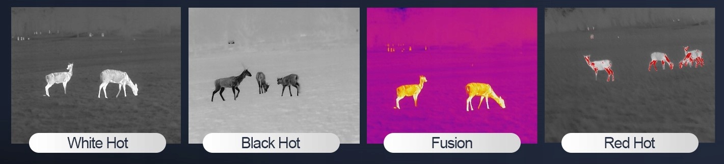 Тепловізор надає 4 колірні палітри, що відображають температуру спостережуваних об’єктів (Black Hot, White Hot, Red Hot, Fusion). Перемикання між різними палітрами надзвичайно інтуїтивно зрозуміле та швидке, і ви можете налаштувати певну палітру відповідно до поточних погодних умов.