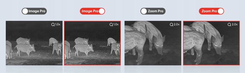Пристрій оснащено постійним 3,5-кратним оптичним збільшенням, яке, у поєднанні з 8-кратним цифровим зумом гарантує нам можливість точного визначення цілі на великій відстані. Завдяки підтримці алгоритмів ImagePro та ZoomPro зміна роздільної здатності зображення набагато менш помітна порівняно зі старішими та конкурентними моделями. У нашому розпорядженні чотири колірні палітри відображеного зображення, тому ми можемо налаштувати його відповідно до своїх уподобань. Кільце регулювання фокусування дозволить нам ідеально регулювати різкість зображення відповідно до відстані.