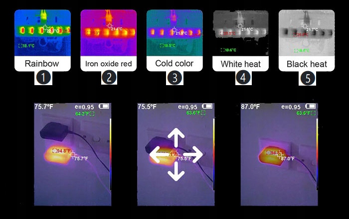 - палітра: залізний червоний, веселка, висококонтрастна веселка, відтінки сірого (біле світіння) і відтінки сірого (чорне світіння)