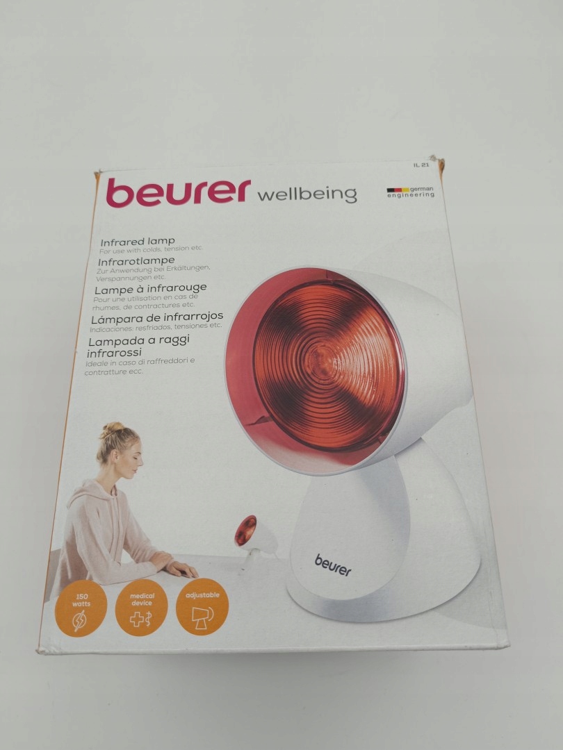 Інфрачервона лампа Beurer IL 21 забезпечує глибоке проникнення тепла і може використовуватися при застуді та м'язовій напрузі. Інфрачервоний обігрівач потужністю 150 Вт також підходить для догляду за обличчям і красою, особливо для забрудненої шкіри. Абажур можна регулювати в 5 градусах нахилу, що дозволяє оптимально підлаштуватися під бажану зону обробки. Інфрачервона лампа є сертифікованим медичним виробом і виробляється в ЄС.