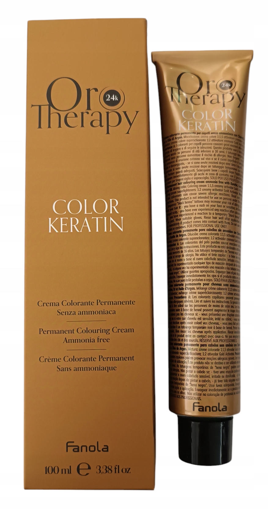 Color Keratin is Інноваційна система постійного забарвлення без аміаку . Він збагачений кератином, золотом та аргановою олією.