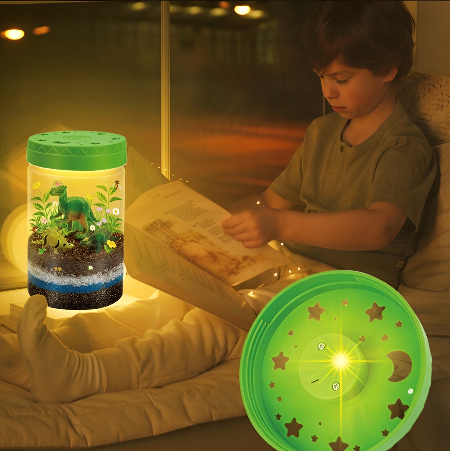 -це проект, який дозволяє дітям створювати власний міні-террарій з рослинами, в яких будуть жити динозаври. Набір включає пластиковий контейнер з кришкою, оснащеною отворами вентиляції та вбудованою світлодіодною лампою (живиться від 3 акумуляторів AG3), яка забезпечує рослинам додаткове світло, сприяє їх росту. Барвисті камені та ґрунт слід розміщувати відповідно до інструкцій. Сірі та квіти після посадки створить природне середовище для трьох динозаврів. Додані наклейки дозволяють прикрасити тераріум відповідно до власних ідей. Набір підтримує розвиток творчості та вчить основи догляду за рослинами.