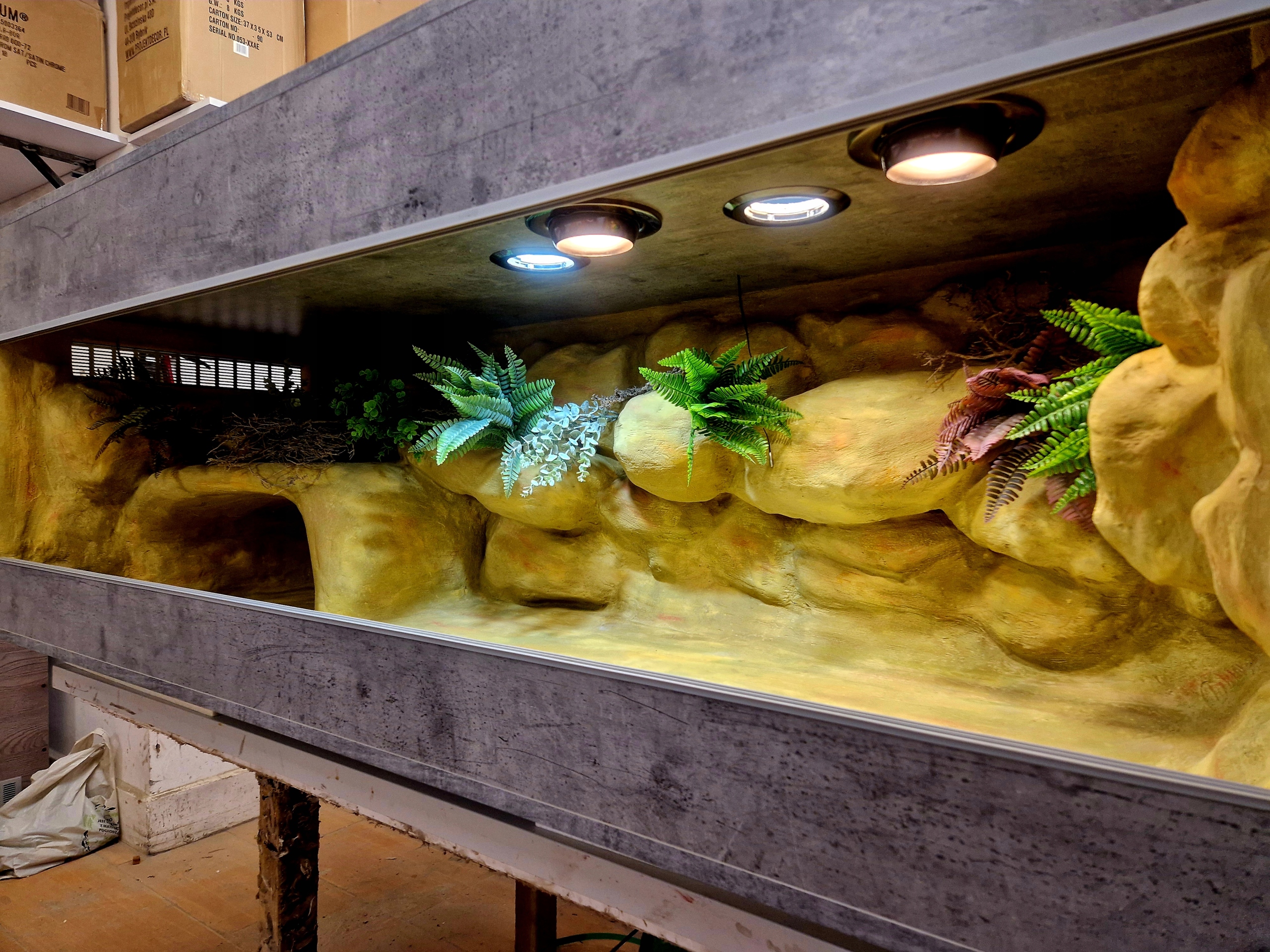 На фотографіях показані тераріуми, які ми зробили для індивідуального порядку, і можуть бути моделлю для наступних робіт. Терарія, замовлена вами, не буде копією, як представлені нижче - але вони можуть бути подібними. Ми будуємо кожен танк з нуля. Покупець має можливість вибору скельної системи (наскільки це можливо) та фонового кольору тераріуму.