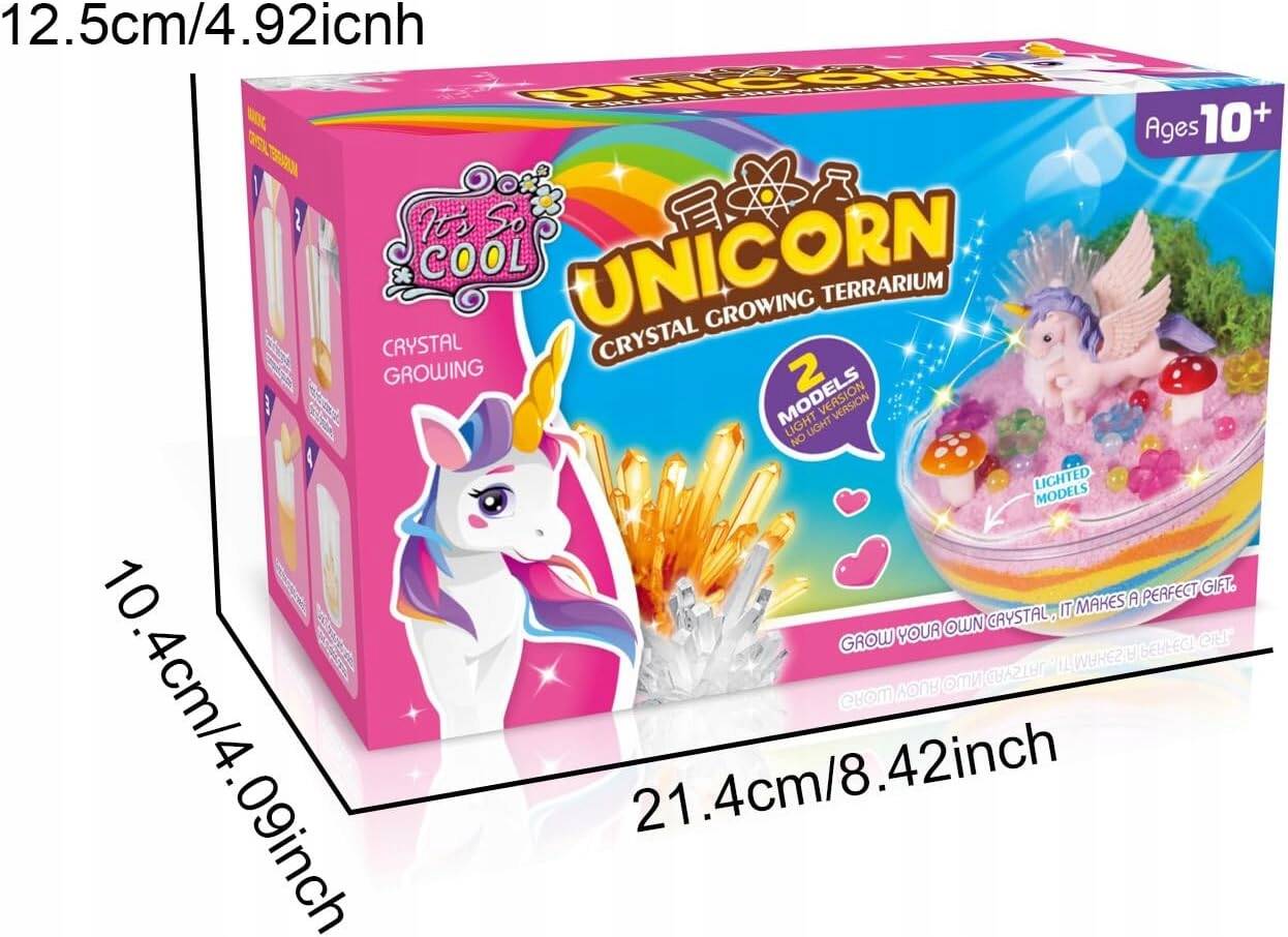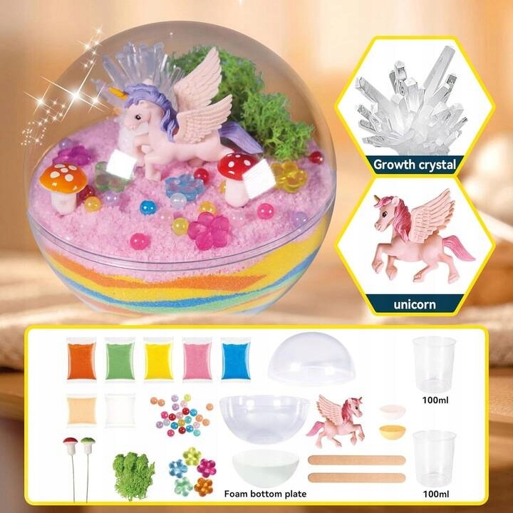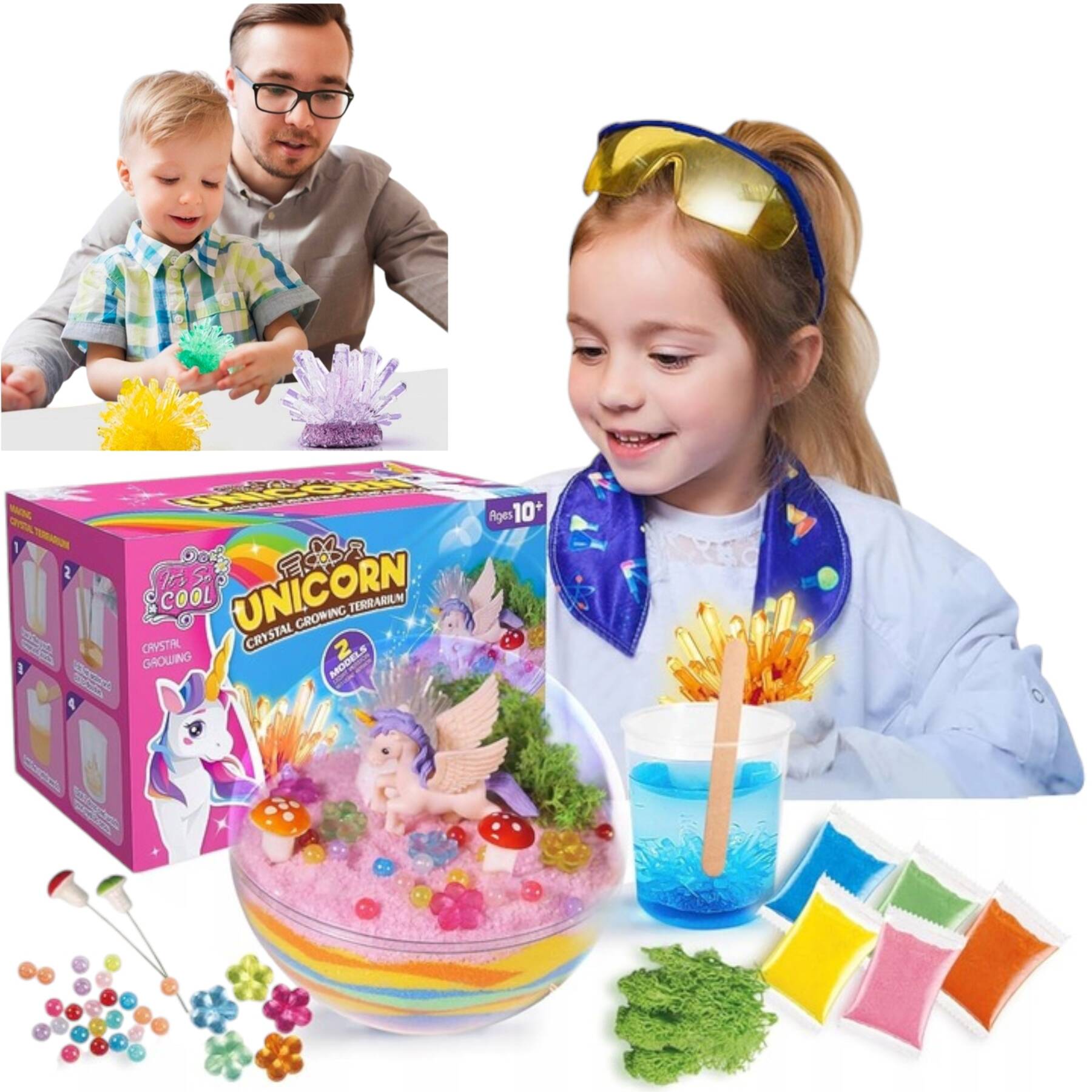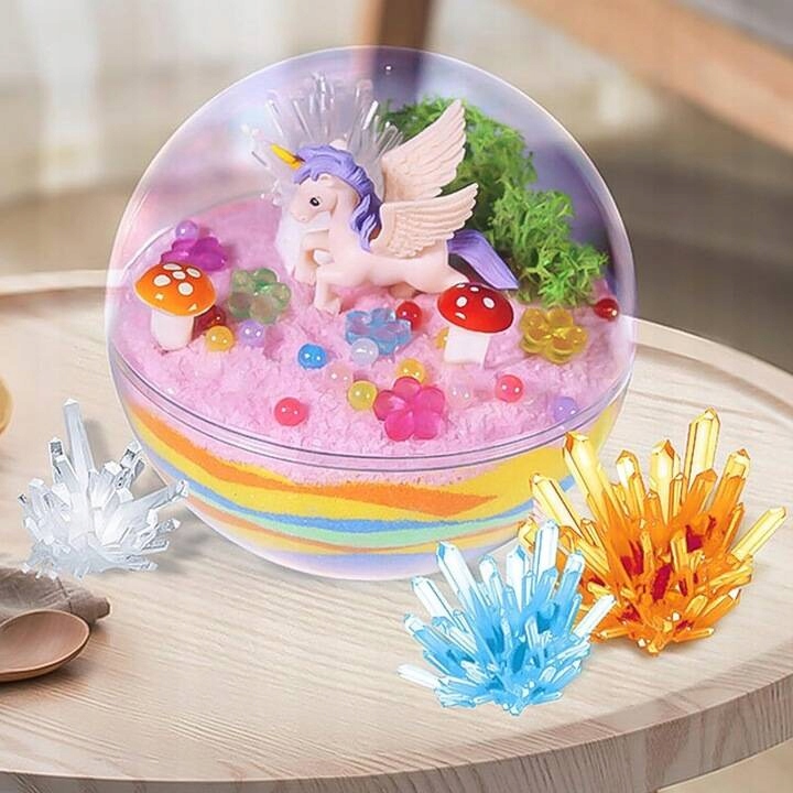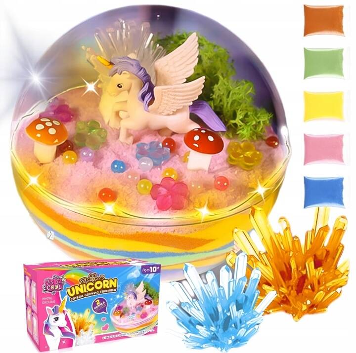 Ваш власний чарівний світ кристалів у вас під рукою! Завдяки цьому набору ваша дитина не тільки дізнається, як виготовляються кристали, але й зможе створити власний унікальний тераріум із милим єдинорогом. Ідеальний подарунок для маленьких вчених і творчих душ!