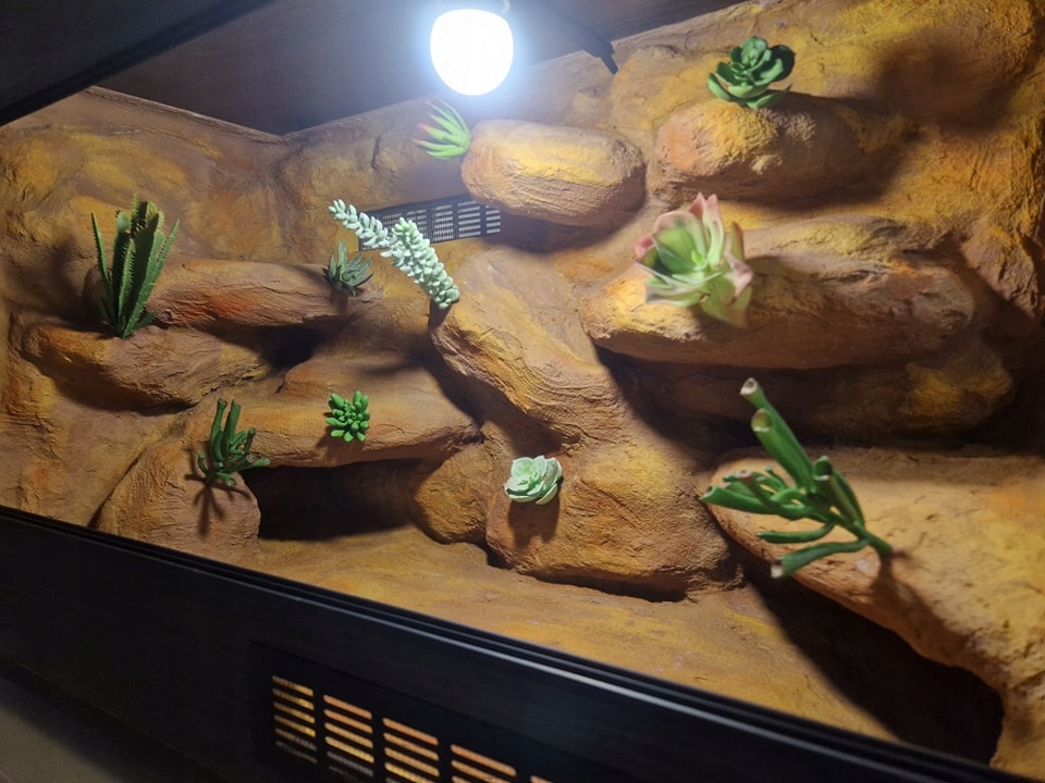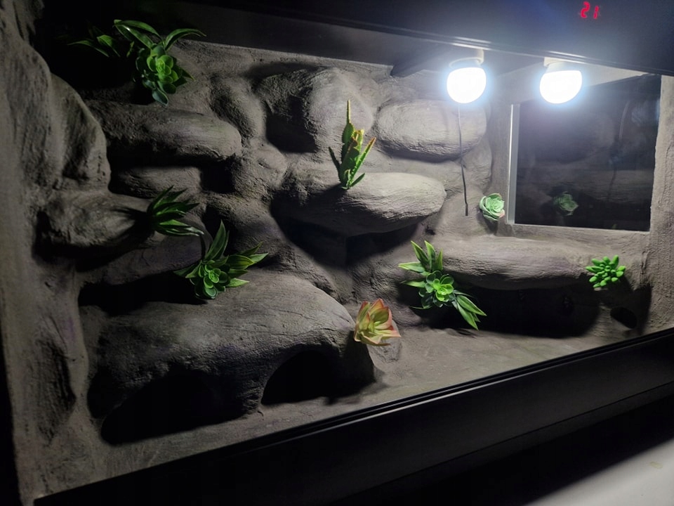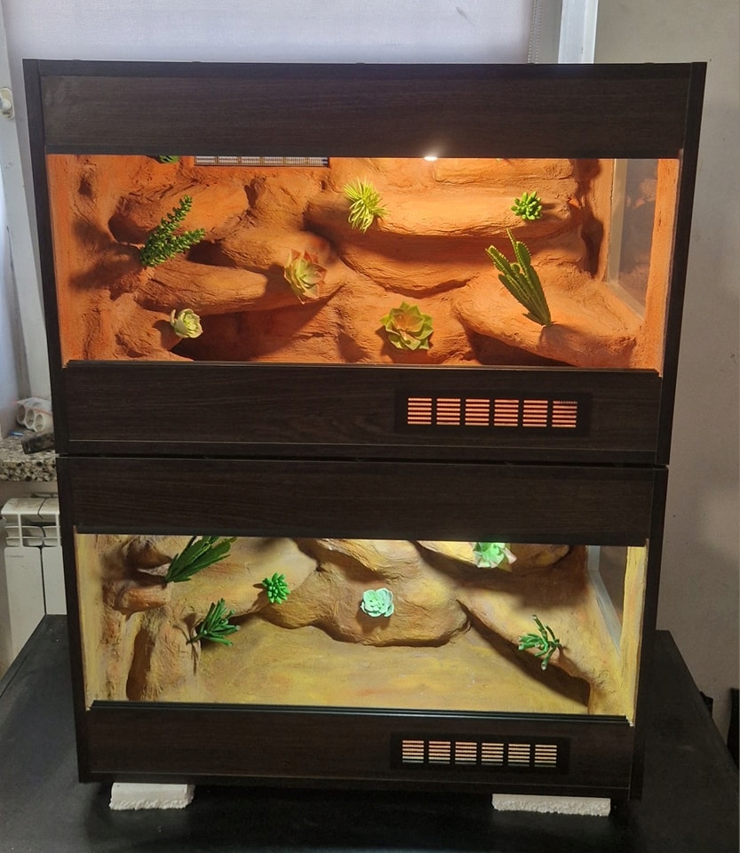На фото представлені тераріуми, виготовлені нами на індивідуальне замовлення і можуть бути зразком для наступних робіт. Тераріуми, які ви замовляєте, не будуть копіями представлених нижче, але вони можуть бути схожими. Ми будуємо кожен танк з нуля. Покупець може вибрати розташування каменів (якщо це можливо) і колір фону тераріуму.