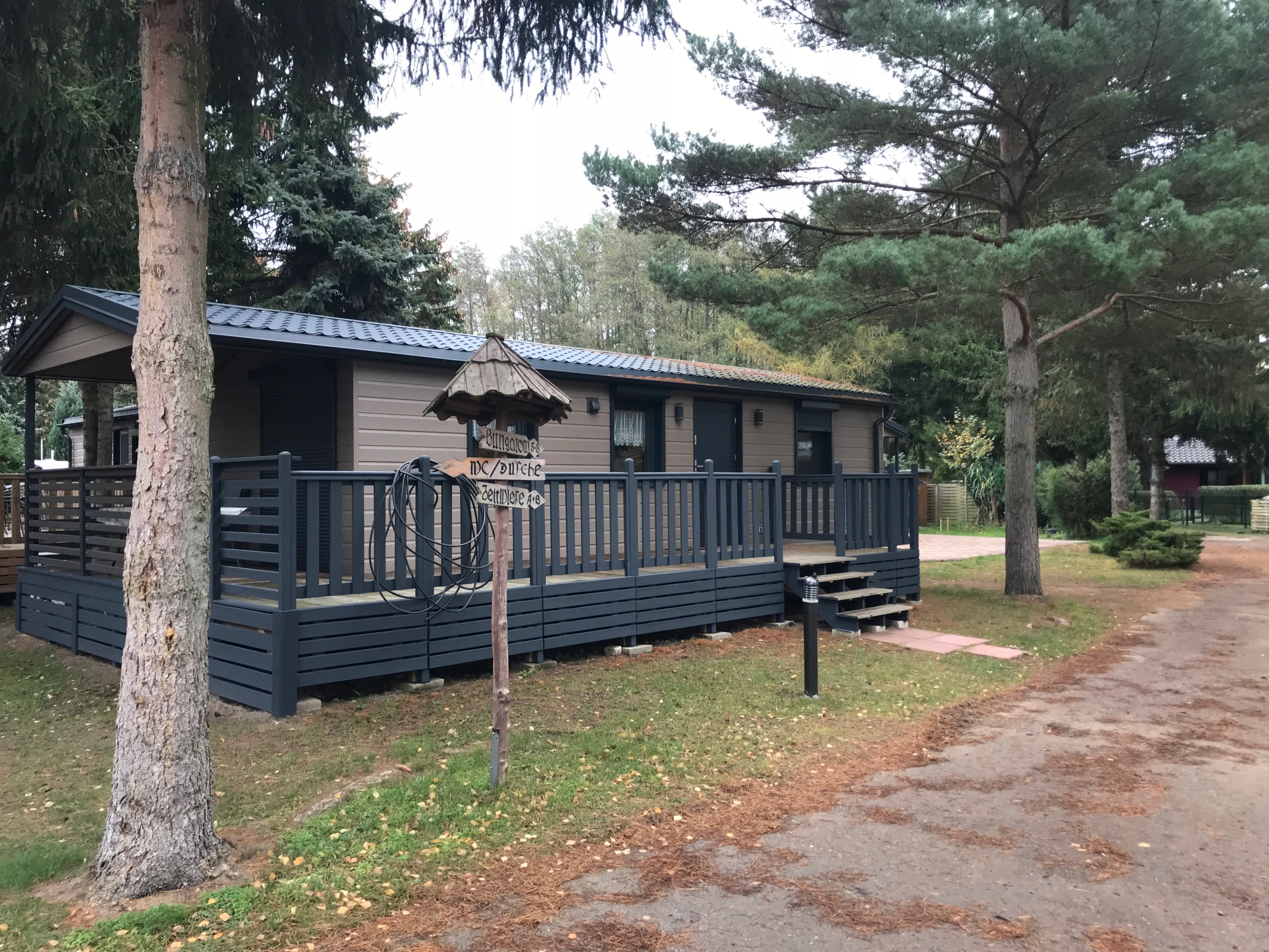 . Час установки - макс. 6-7 годин. Наші тераси заздалегідь зібралися і вирізаються на розміри у виробничому залі, що спричиняє короткий час складання на ділянці. Дерев’яні стовпи, підлоги урочищ, виготовлені з каналів з 2,5 см, терасовими решітками, набором сходи, дерев’яних сходів, -(ціла повна тераса), набір скручених гвинтів, набір гвинтів тераси, набору гумових прокладок від гранул до взуття до тривоги вібрацій у той самий час, що втеплює до вологи, при необхідності, якщо це потрібно Сервісні таблички. Це колір, що надається просоченням тиску.