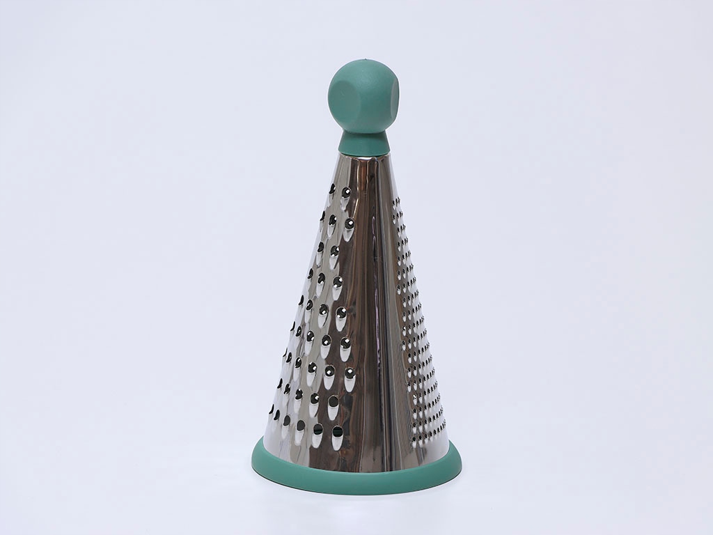 Терка з нержавіючої сталі з кольоровими деталями. Він має два типи лез для дрібнішого чи більш грубого натирання.