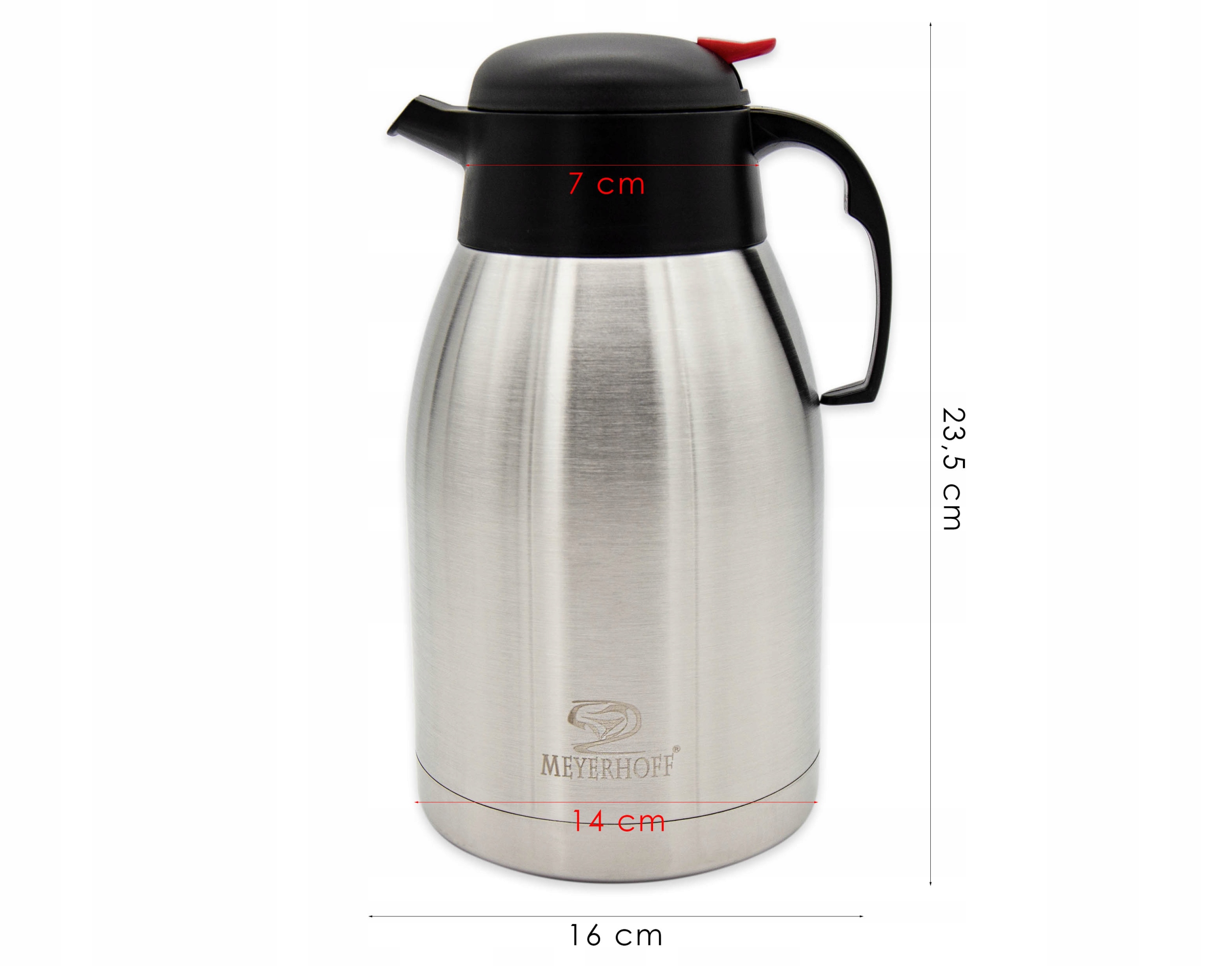 Термос конференції Поважна марка meyerhoff була виготовлена з високої якості нержавіючої сталі з вакуумною ізоляцією, що дозволяє тривати температуру теплих і холодних напоїв всередині термоса. Практична система відкриття та закриття з використанням кришки з кнопкою робить використання термоса легким та зручним. без відключення Ми можемо легко залити напій у склянку або чашку. Особливо профільований дзьоб запобігає розливу рідини, що забезпечує повне задоволення використанням продукту.