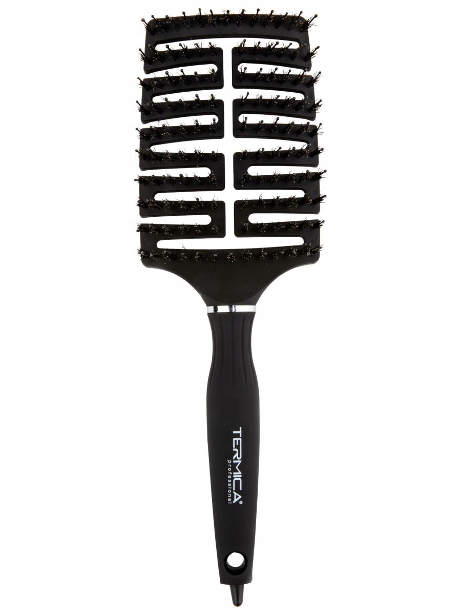 кисть для волосся Termica Nylon & Dzik Flex містить суміш нейлонових волокна та натуральних диких щетинок. Профілеровані вентиляційні отвори прискорюють сушіння близько 40%, а гнучкий тіло адаптується до форми голови.