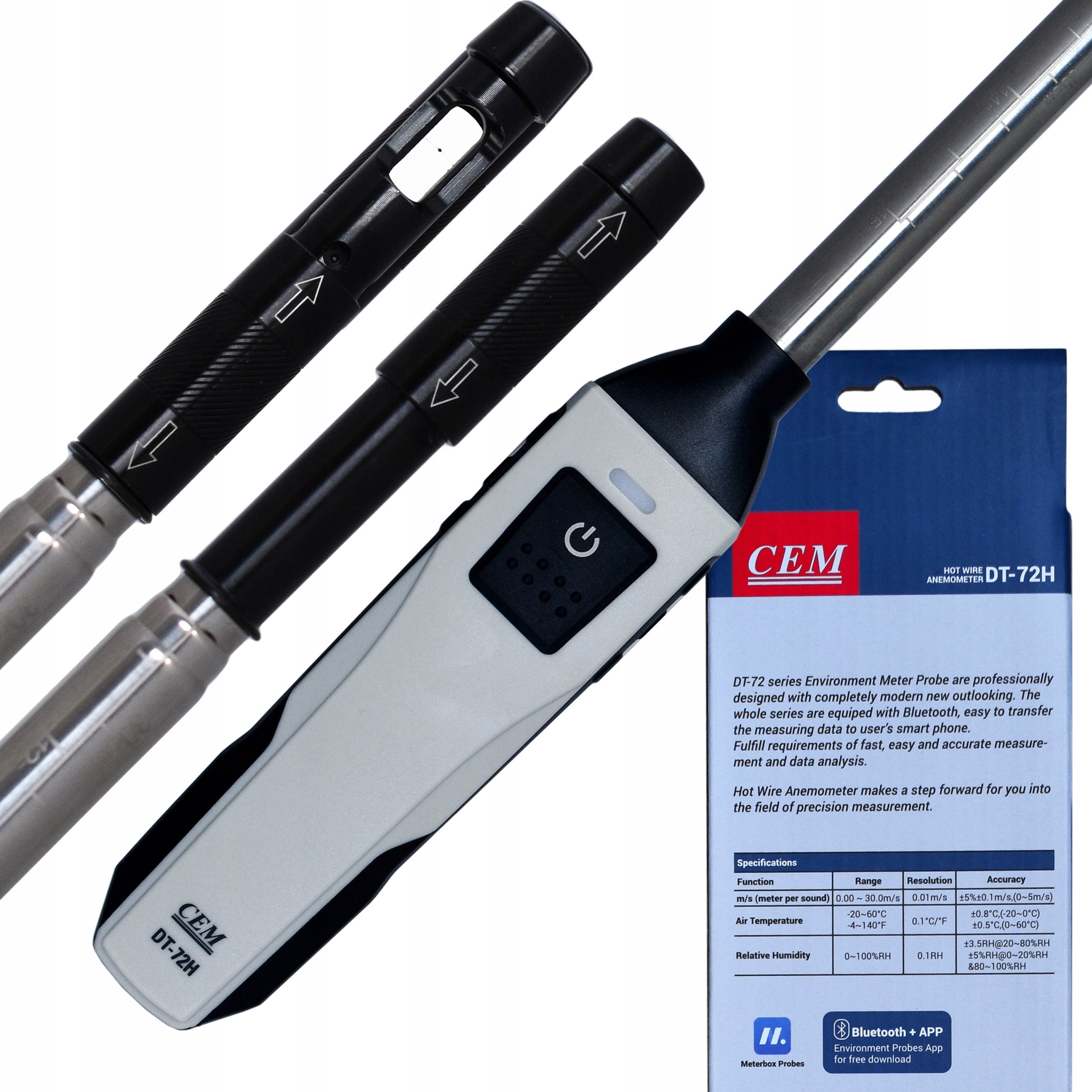анемометр із складним зондом, вимірювання температури, вологості та потоку повітря. Мініатюрний вимірювальний елемент гарантує швидкі показання, швидкість вітру, вологість та температуру. Значення вимірювання відображаються на екрані смартфона в програмі Meterbox Probes. Невеликий розмір уряду допомагає працювати в важких місцях.