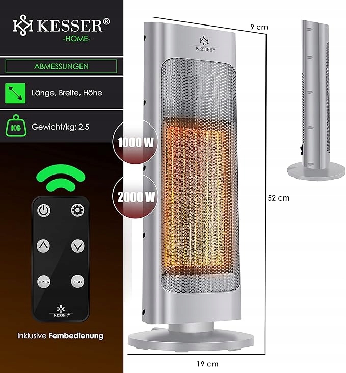 Мережева штепсельна штекер: інтегрована назавжди. Три рівні тепла: 1000 Вт, 2000 Вт . Розміри нагрівальної вежі: 52 см x 9 см х 19 см (висота x глибина x ширина). Діаметр плінтуса: 19 см . Тип випромінювання: нагрівальний елемент PTC з інфрачервоним інфрачервоним сталь, захисна решітка, автоматичне вимикання через 12 годин .