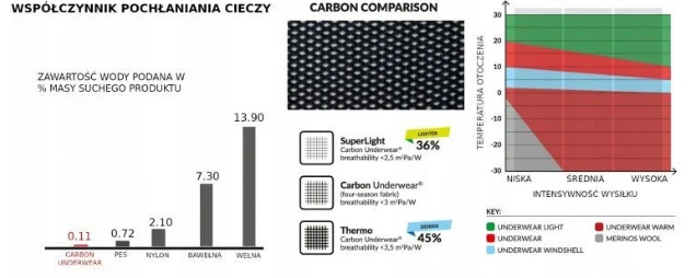 - Дуже легкий, на 40% легший за всесезонну версію CARBON UNDERWEAR (0,92 г/см3), що становить приблизно 0,59 г/см3.