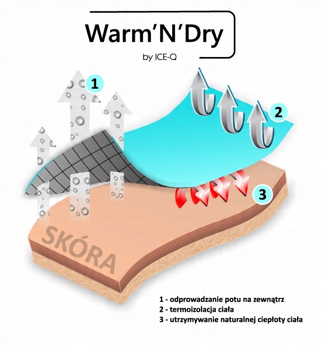 Warm'N'Dry – тканина з високими термоактивними параметрами. Warm'N'Dry підтримує постійну відповідну температуру тіла незалежно від температури зовнішнього повітря, одночасно дозволяючи волозі швидко випаровуватися. Незважаючи на видалення надлишку водяної пари, тканина зберігає тепло навколо тіла, не даючи вам замерзнути. Q-Breath - швидковисихаючий матеріал. Внутрішній шар приємний при контакті з тілом. Зовнішня частина має елегантні смуги. Все це гнучке, що дозволяє правильно пристосуватися до тіла. Q-Breath – антиалергічна та антибактеріальна тканина.