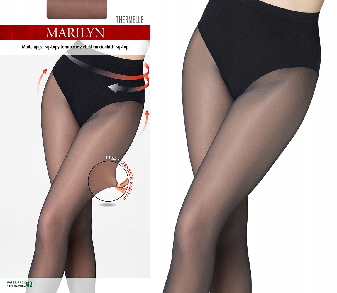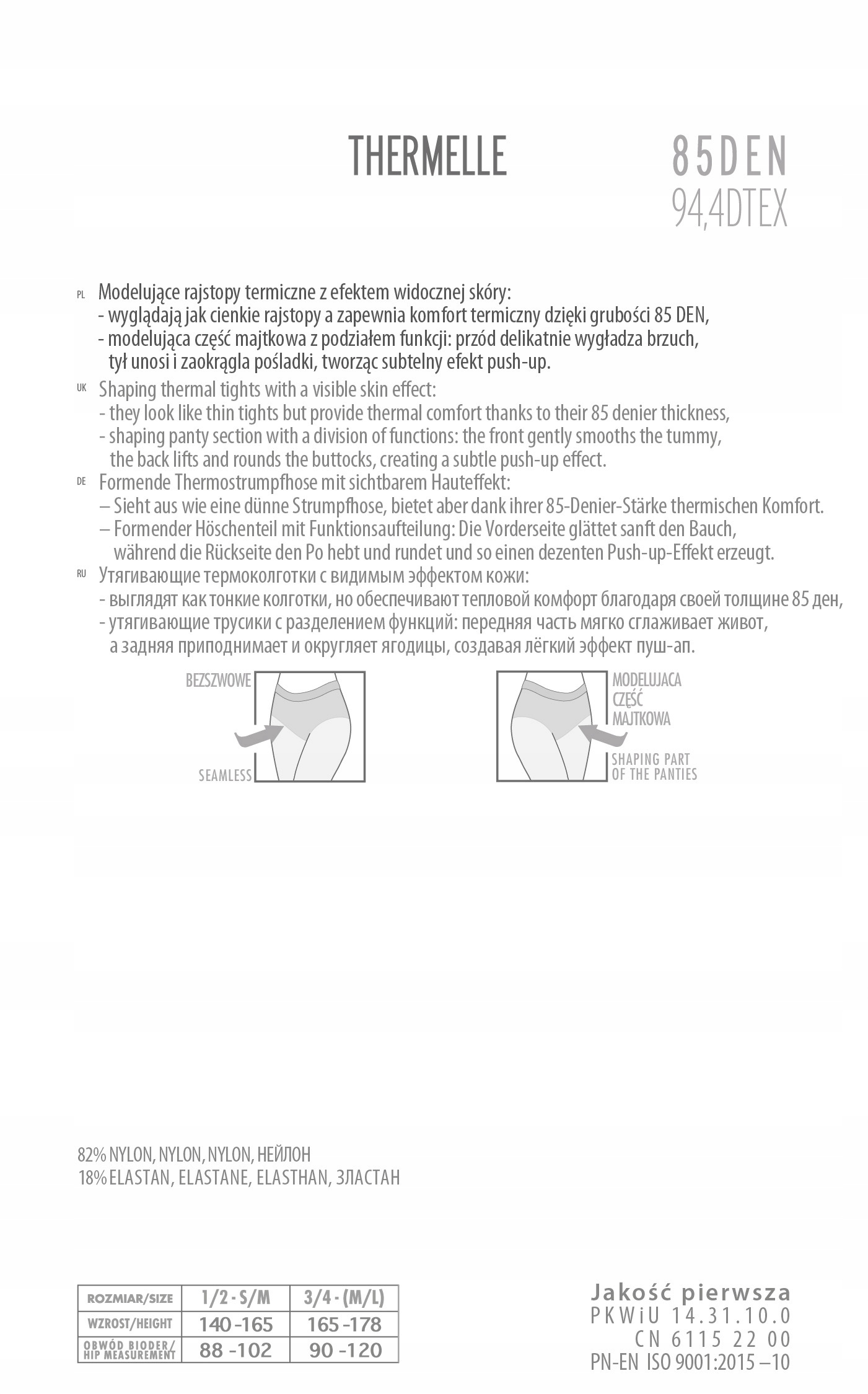 THERMELLE – моделюючі колготки щільністю 85 деньє з видимим ефектом шкіри. Це інноваційне поєднання елегантного зовнішнього вигляду тонких колготок з функціональністю теплої білизни. Міцна частина трусиків згладжує лінію живота, а спина піднімає і округлює сідниці, створюючи природний ефект пуш-апу. Гнучка, м'яка тканина адаптується до фігури, забезпечуючи свободу рухів і комфорт при носінні. Це пропозиція, яка поєднує в собі жіночний стиль і практичний захист від холоду.