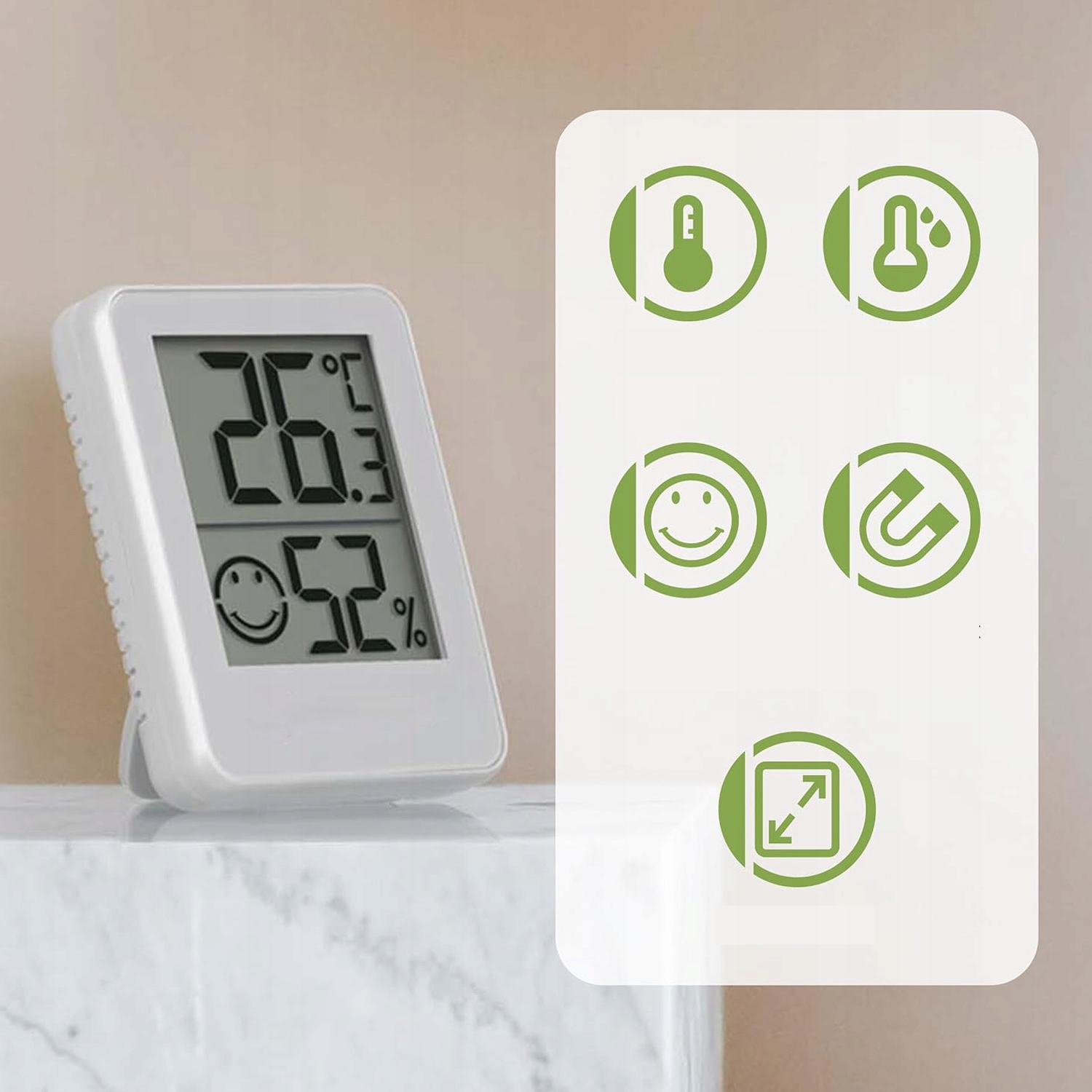 ✅3 способи встановлення:кімнатний термометр можна розмістити на складній підставці або закріпити на стіні через отвір для підвішування на задній панелі; Завдяки вбудованому магніту внутрішній гігрометр також можна прикріпити до металевої поверхні. Живлення від CR2032 (батарея входить), термін служби батареї до 12 місяців.