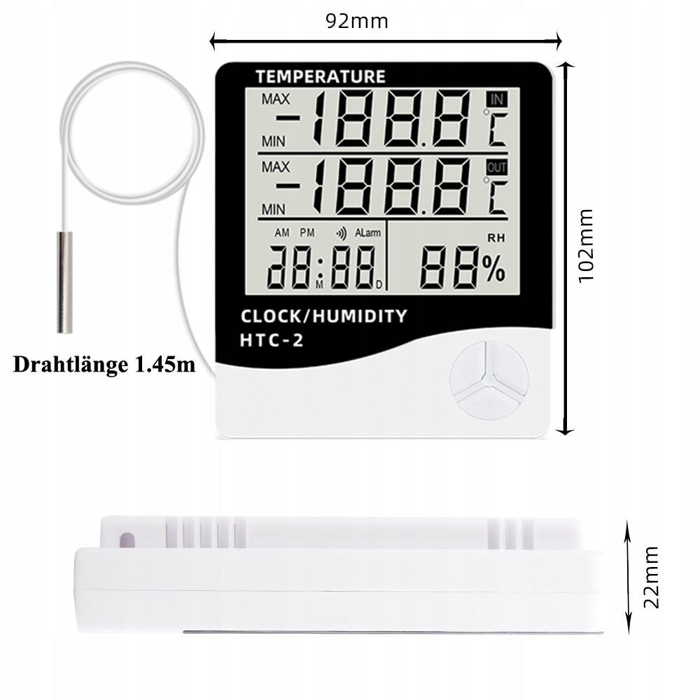 - HTC-2 — це оновлена версія, 2 рядки для відображення вхідної/вихідної температури, з 1,5-метровим вимірювальним кабелем (тільки для вимірювання температури), ви можете отримати точніші параметри в деяких місцях, наприклад в акваріумі, складі, акваріумі, техніці, лабораторії тощо.
