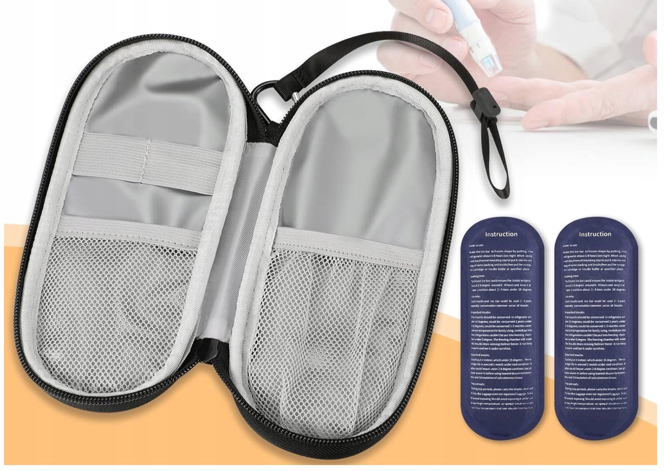 ✔️ Просторідві еластичні кишені - можна вмістити такі предмети, як інсулінові ручки, флакони чи шприци. У нижній сітчастій кишені зберігається пакет із льодом.