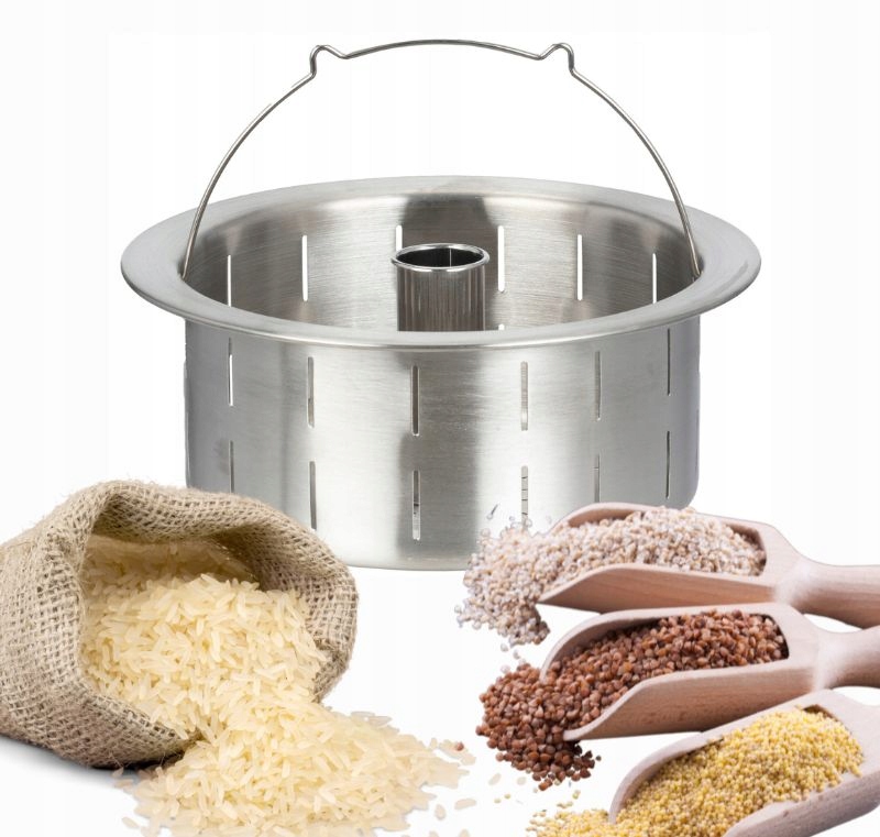 - Конструкція: Кошик розміщений всередині кухонного комбайна. Завдяки цьому сипучі продукти ізольовані від води, але в той же час рівномірно готуються завдяки циркуляції пари та гарячої води