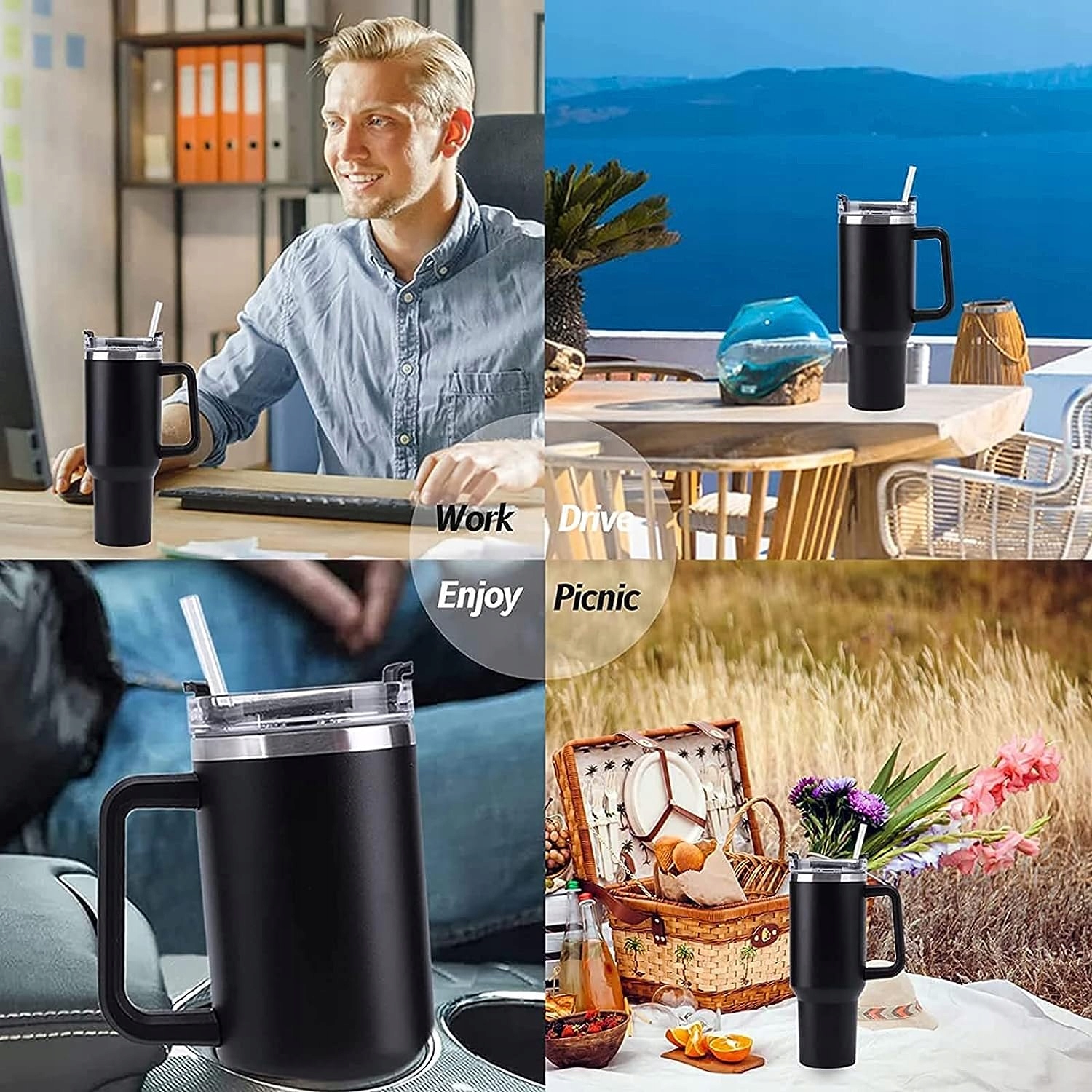 Кухоль має щільне та просте закриття. Щільно закрийте велику кришку. Натисніть і перемістіть вузький ковпачок у відповідному напрямку, щоб вихід трубки проходив через отвір у ковпачку. Коли ви закінчите пити, знову закрийте кришку, щоб захистити кришку від проливання. Спеціальні отвори дозволяють пити як через соломинку, так і зазвичай через отвір.