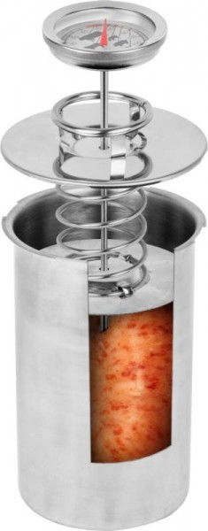 Надійний гастрономічний термометр із високоякісної нержавіючої сталі. Ідеально підходить для контролю температури під час процесу випічки, копчення або приготування. Пристрій характеризується широким температурним діапазоном - від 0 до 100°C. Для точного вимірювання на шпажці є спеціальний датчик температури - щуп, який точно вимірює температуру приготованої страви. Також на циферблаті є графічна шкала, що вказує правильну температуру для птиці, свинини, телятини, баранини та яловичини. Пристрій має великий читабельний білий циферблат.