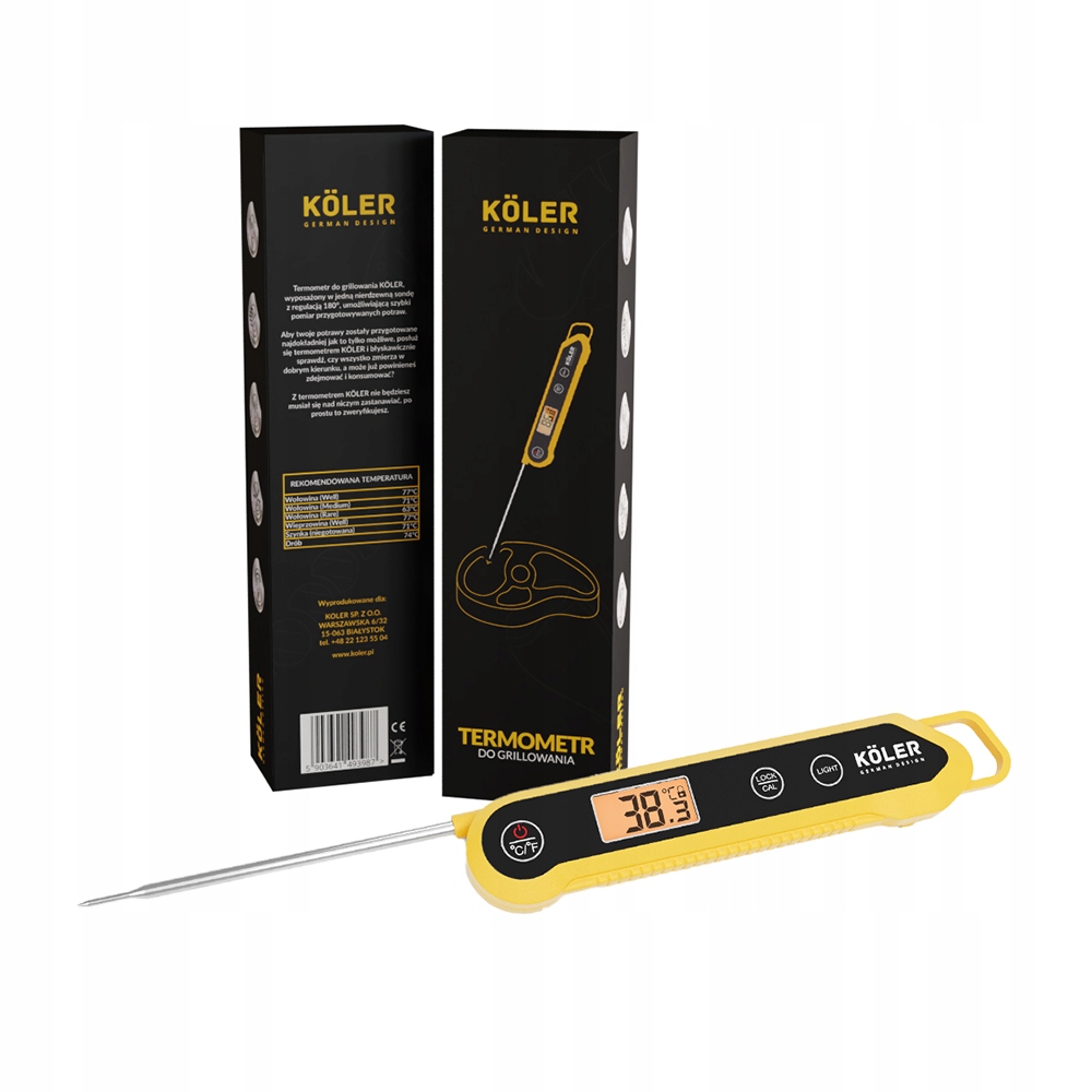 Термометр для гриля KÖLER, оснащений одним зондом з нержавіючої сталі з регулюванням на 180°, що дозволяє швидко вимірювати готові страви. Щоб ваші страви були приготовлені якомога точніше, скористайтесь термометром KÖLER і швидко перевірте, чи все йде правильно, чи, можливо, варто просто вийняти його та з’їсти? З термометром KÖLER вам не доведеться ні про що думати, ви можете просто перевірити це.