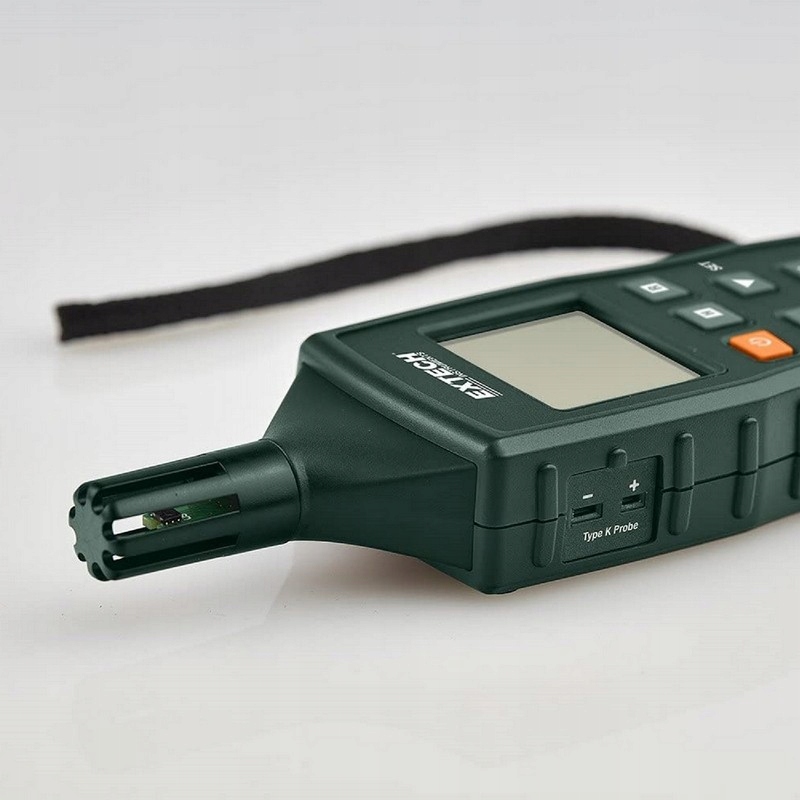 RHT510 вимірює відносну вологість, температуру повітря, температуру точки роси, температуру за вологим термометром і температуру K-типу (із зовнішнім датчиком).