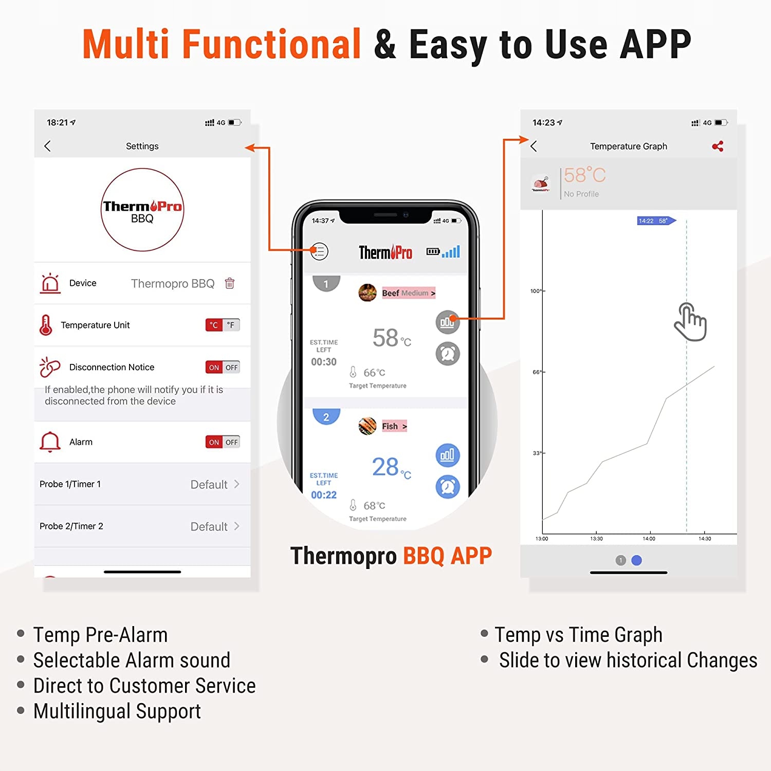 Інноваційне застосування: Термометр барбекю простий у використанні із додатком для барбекю Thermopro. Ви можете вибрати популярний звук тривоги, температуру. Встановіть тривогу прогнозування, за винятком попередньопрограмованого меню кроків для приготування їжі, редагувати інші типи м'яса з графікою температури, чітко слідкуйте за підготовкою м'яса, зверніться до служби обслуговування клієнтів Thermopro безпосередньо та іншого. Додаток можна завантажити безкоштовно з App Store та Google Play.