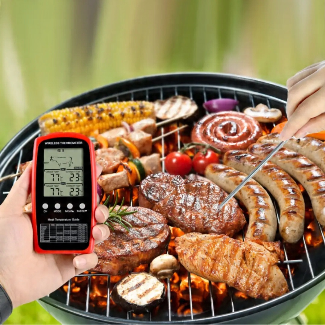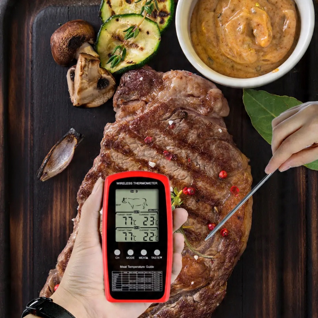 ☑️ Бездротовий термометр із двома зондами ☑️ Широкий температурний діапазон (від -50°C до 300°C) ☑️ 8 програмованих режимів для різноманітного м'яса ☑️ Сигналізація температури ☑️ Чіткий дисплей із підсвічуванням