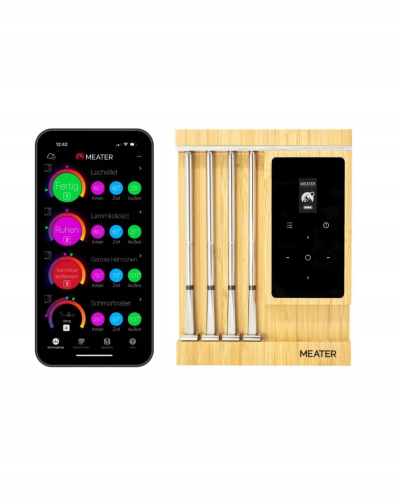 Meatre Pro XL - сучасний інтелектуальний термометр, створений для ентузіастів ентузіастів на грилі та приготування їжі. Завдяки безкоштовному додатку для iOS або Android, ви можете точно стежити за температурою страв на кухні, на грилі або на ходу (інтеграція з хмарою килима). Використовуючи додаток, ви можете встановлювати таймери, сповіщення, а також використовувати інструкції для приготування різних типів м'яса. Ви також можете шукати професійні поради та рецепти від шеф -кухарів для приготування виняткових страв! З їх допомогою, товариш Pro XL дозволяє одночасно контролювати кілька шматочків м'яса або декілька різних частин смаженої. З Smart Tempe Temple Multisensor Mateater Pro XL здатний встановити найнижчу реальну температуру в м'ясі, що дозволяє досягти ідеальних результатів. У фритюрниці. Вони виглядають естетичними, їх легко чистити та водонепроникний, мити під проточною водою або в посудомийній машині. Bluetooth 5.2 збільшує діапазон бездротового зв'язку, тоді як WiFi розширює діапазон домашньої мережі. Дисплей OLED Touch дозволяє контролювати температуру без необхідності завантаження програми. Спеціальна конструкція дозволяє здійснити аварійну 5-хвилинну зарядку, щоб забезпечити 2 години використання.