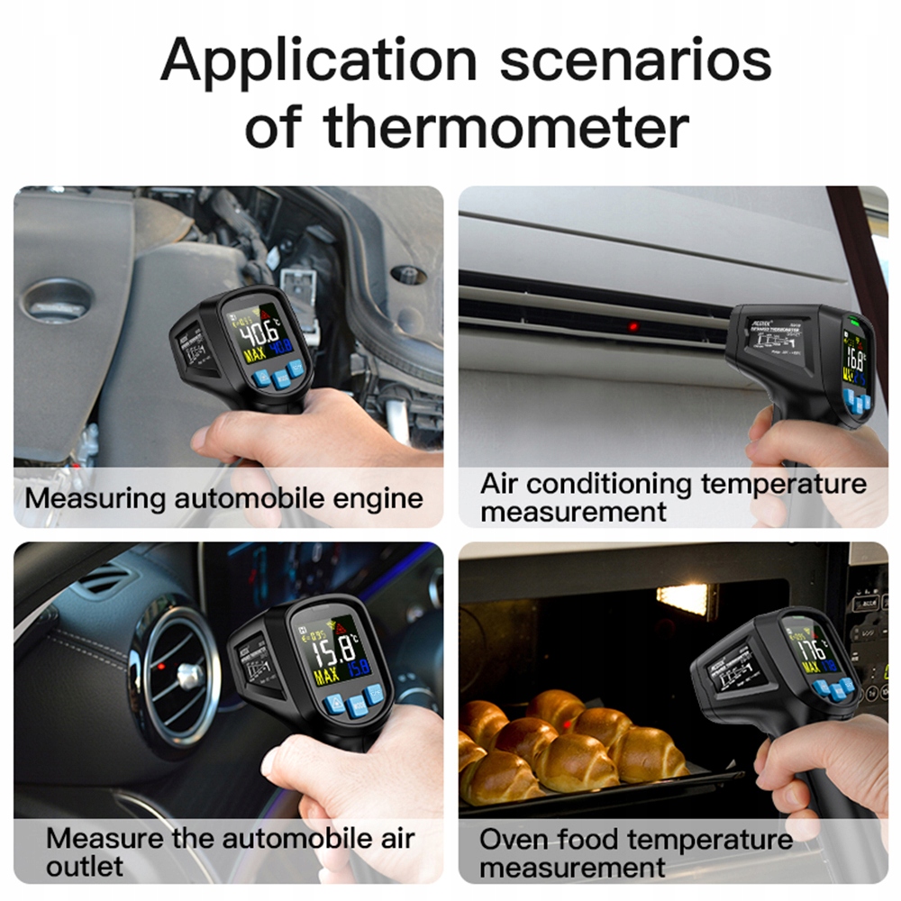 Широке застосування: можна використовувати для безконтактного вимірювання температури двигуна автомобіля/повітрявиходу, кондиціонера, нагрівання духовки тощо.