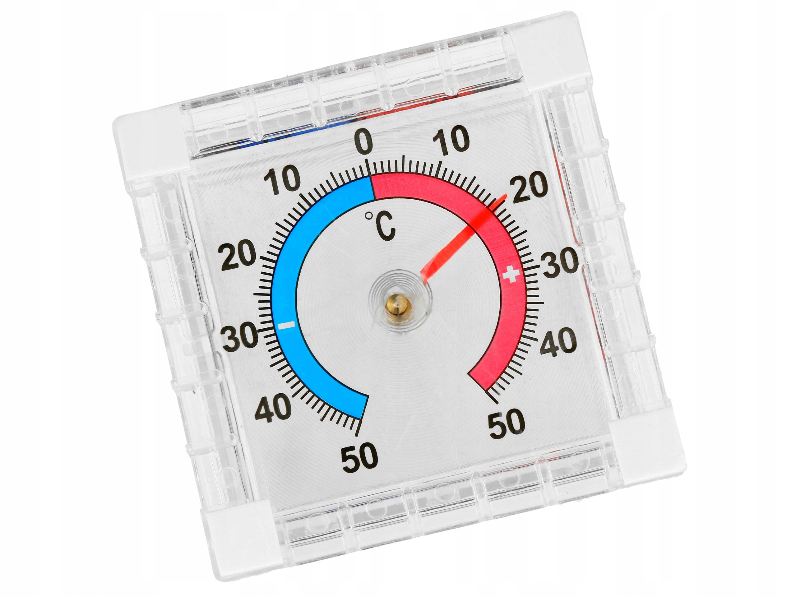 Біметалічний термометр квадратної форми, виготовлений із прозорого пластику.