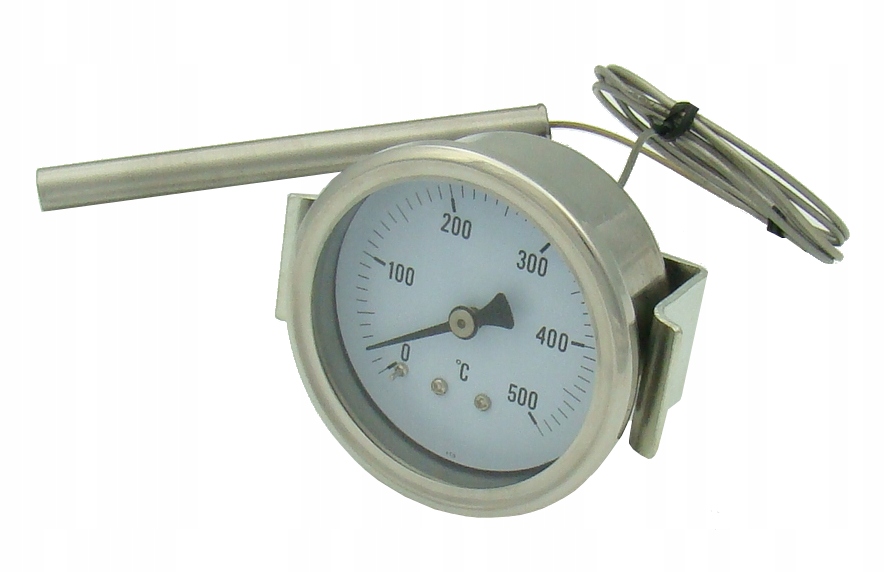Предметом пропозиції є популярний стрілочний термометр із щупом 120 мм. на капілярі 1100мм Зонд з нержавіючої сталі. Діапазон вимірювань від 0 до +500 градусів С. Термометр, який часто використовують у котлах, печах тощо. Типовий принцип роботи – капіляр (тонка трубка) заповнений рідиною, яка змінює свій об’єм під впливом температури та змушує стрілку змінювати. відхиляються за шкалою термометра.
