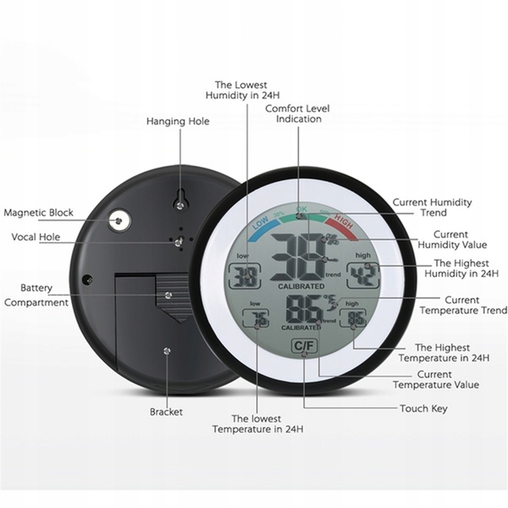 Цей цифровий лічильник може одночасно відображати температуру та вологість із відображенням максимальних та мінімальних значень. Підходить для розміщення на столі або підвісці на стіні.