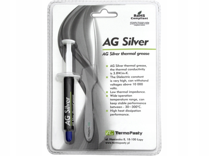 AG Silver - це термопаста з додаванням сполук срібла. Теплопровідність значно вища, ніж у типових вуглець-кремнієвих сполук. Продукт відповідає вимогам директиви ROHS.