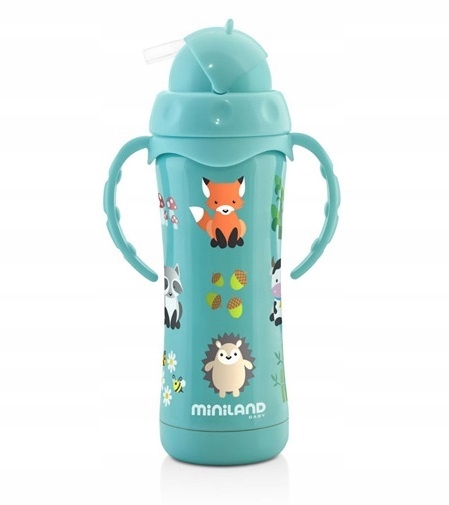 Металеве та бірюзове покриття пляшка та кумедні зображення тварин привабливі для дітей.